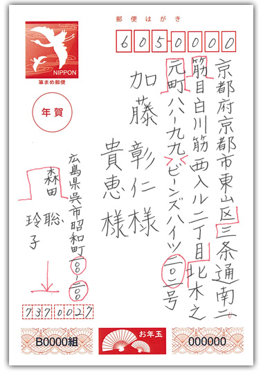 上のはがきを先生に添削いただいた。赤字は先生による指摘ポイント。「住所を改行する場合は、切っていいところとダメなところがあります」(神林先生)。