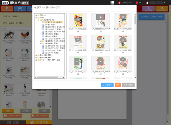 「Web筆まめ」は、1ユーザあたり3,000円/年で利用できるオンラインサービスで、年賀状作成ソフト『筆まめ』と同じような機能がWeb上で利用できるというものだ。テンプレートよりデザインを選ぶところからレイアウト、宛名印刷まで、ソフトのインストールなしにすべてWeb上で操作できる、なかなかすごいサービスだ。