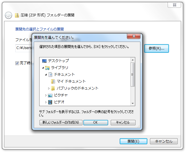 (10) 「展開」ボタンをクリックすると、ファイル名と同じ名前で新しいフォルダが作成され、