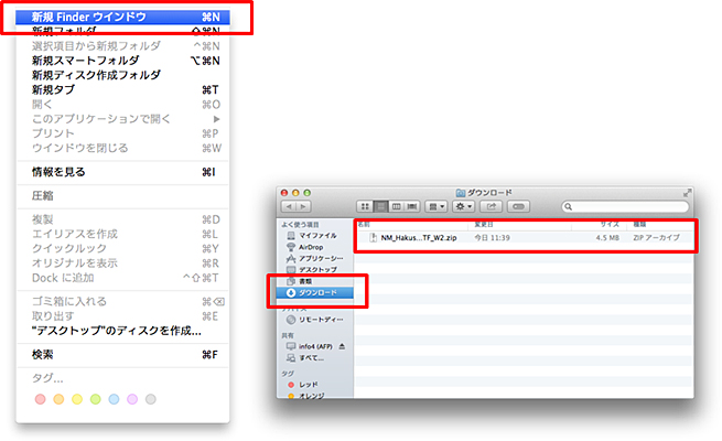 ・Finderから開く場合は[ファイル]メニューの[新規Finderウインドウ]を選択し、開いたウインドウの[ダウンロード]をクリックします。(ウインドウの表示は設定により異なります)