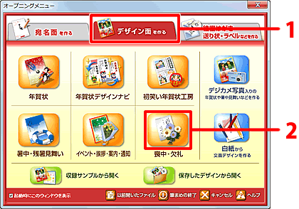 1.オープニングメニューの[デザイン面を作る]タブをクリックし(1)、[喪中・欠礼]をクリックします。(2)