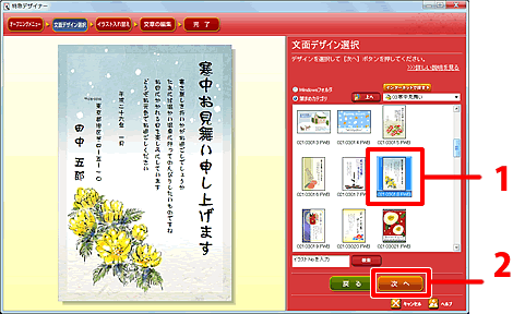 3.お好きなデザインをクリックし(1)、[次へ]をクリックします。(2)