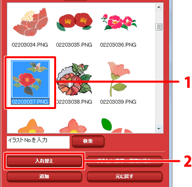 4.使用したいイラストをクリックし(1)、[入れ替え]をクリックします。(2)