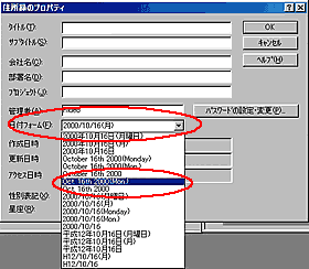 [ 住所録のプロパティ ] ダイアログ ボックスが表示されます。 [ 日付フォーム ] の▼ボタンをクリックします。 変更したい日付フォームをクリックして選択します。
