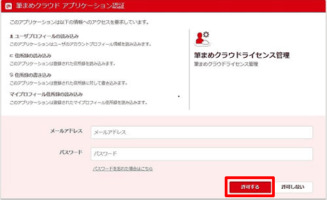 筆まめクラウドライセンス管理を開き、登録したメールアドレスとパスワードを入力し、「許可する」のボタンをクリックします。