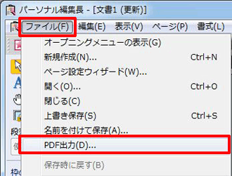 当該ファイルを開き、メニューバー「ファイル」-「PDF出力」をクリックします。
